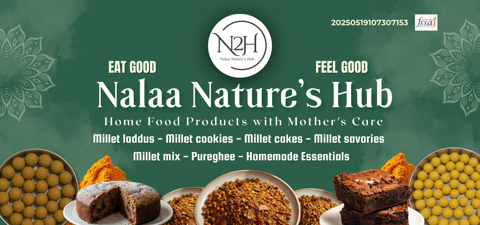 At Nalaa Nature’s Hub, we believe wellness begins with the choices you make every day. Our mission is to bring you pure, natural, and handcrafted products that blend the richness of tradition with the needs of modern living. From millet laddus, wholesome flours, authentic podis and masalas, to cold-pressed oils, herbal skin and hair care, and even healthy millet cakes, every product is created with honesty, care, and a deep respect for nature. With no preservatives and no shortcuts, we promise you goodness that nourishes your body, delights your taste buds, and celebrates the essence of natural living.