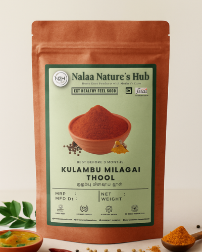 Nalaa Nature’s Hub Kulambu Milagai Thool is a traditional South Indian spice mix crafted to bring depth and flavor to a variety of kulambu dishes. Made with a balanced combination of coriander, cumin, fennel, turmeric, and pepper, blended with aromatic spices like cinnamon, cloves, cardamom, and black stone flower, this powder enhances the taste of gravies with authentic homemade essence. Perfect for both vegetarian and non-vegetarian kulambu, it delivers a bold, flavorful experience in every bite.